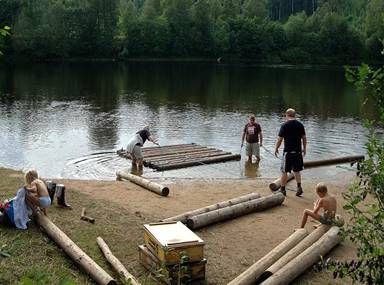 Gegen 9 Uhr werden wir durch lautes Poltern geweckt. Es versuchen mindestens 50 Leute gleichzeitig ihre Flöße zu bauen. Die meisten Familien haben ihre Kinder dabei, es ist eine Riesen Gaudi. Man knotet immer 2 Flösse hinter einander, auf einem sitzt man und auf dem anderen sind in Kisten verstaut die Sachen. Ein Floß hat eine Größe von ca. 3 x 3 m.